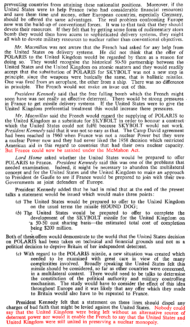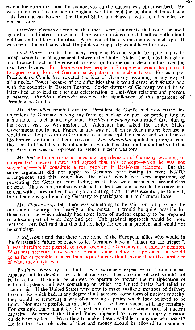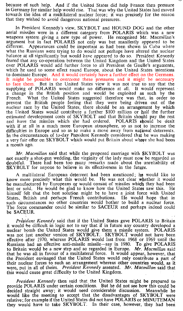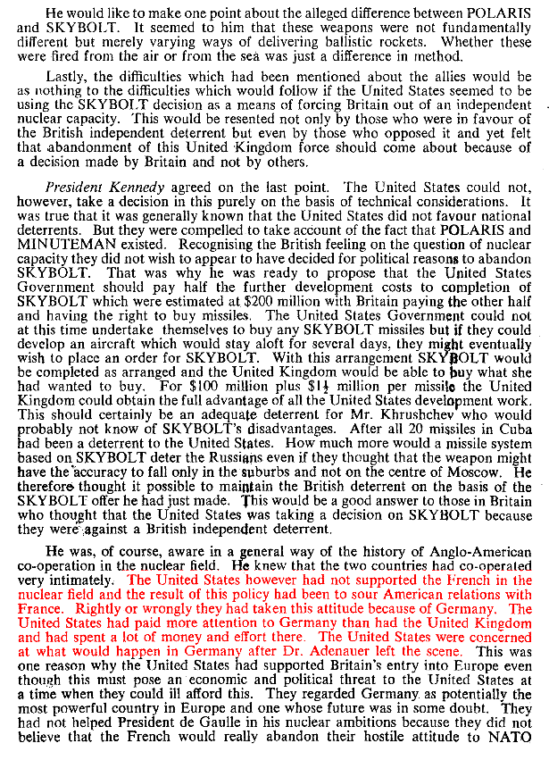 The deletions on the final page relate to the same issue, but in a slightly different way. The censors were trying to conceal the fact that Kennedy was not opposed in principle to the idea of nuclear forces under European national control, and in particular to forces under British and French control.