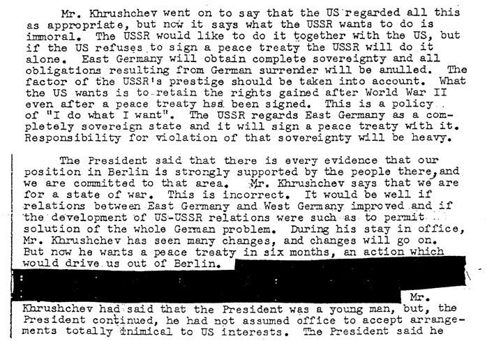 Source: NLK-86-138, released following an appeal in September 1990 by the Kennedy Library; the full version was published in FRUS 1961-63, vol. 14, p. 95, in 1993.The passage blacked out below was one of only two brief passages deleted from the version of this document released in 1990. This passage reads as follows: "If we accepted such a proposition we would lose our ties in West Europe and would lose all our friends there. We do not wish to act in a way that would deprive the Soviet Union of its ties in Eastern Europe." Kennedy was speaking the language of power politics: the United States had a vital interest in maintaining its position in western Europe, just as the Soviet Union had a basic interest in maintaining its position in eastern Europe, and each side should respect the most fundamental interests of the other side. The passage was deleted because the censors want to play down the degree to which the American government thinks in such terms, and in particular the degree to which it was ready to recognize eastern Europe as a Soviet sphere of influence. When the FRUS volume was published, however, the fact that this passage had been deleted served to underscore how important it in fact was.