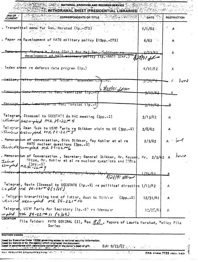 A withdrawal sheet from the Norstad Papers at the Eisenhower Library showing what's been released as a result of MR's researchers have filed. This collection had just been processed when I visited the Eisenhower Library in January 1989. I xeroxed a whole bunch of these withdrawal sheets from the Norstad Papers and from other collections at the DDEL as well. I turned them over to the National Security Archive, which coordinated a very vigorous and effective MR and FOIA campaign to get documents of this sort released. Judging from the fact that the MR date given for the sanitized documents was 1989, I think that some of the releases noted on this sheet resulted from that campaign. The documents crossed out have been declassified in full (with the date of declassification given); the sanitized documents are the ones marked "portions exempted"--the phrase generally got a little truncated in the xeroxing--and are available in part. Often they are only lightly sanitized, and are certainly worth looking at. The word "have" in the extreme right in my marking, and simply indicates I already have a copy of the document in question, which I got from some other source.