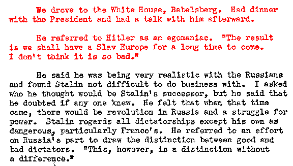 Source: Forrestal Diaries, vol. 2, Forrestal Papers, Mudd Library, Princeton University.The passage in red was deleted from the version of this diary entry in Walter Millis's edition of The Forrestal Diaries, which was published at the height of the Cold War in 1951. (See p. 78 in that book.) This rather extraordinary passage reflects Truman's relatively complaisant attitude toward a Soviet-dominated Europe. The deletion of this passage made it seem that American policy was much tougher at the time of Potsdam than it actually was--a view that both left- and right-wing historians found congenial, albeit for different reasons. This is a striking example of the way a skewed documentary record distorted our understanding of basic American policy in the immediate post-World War II period.