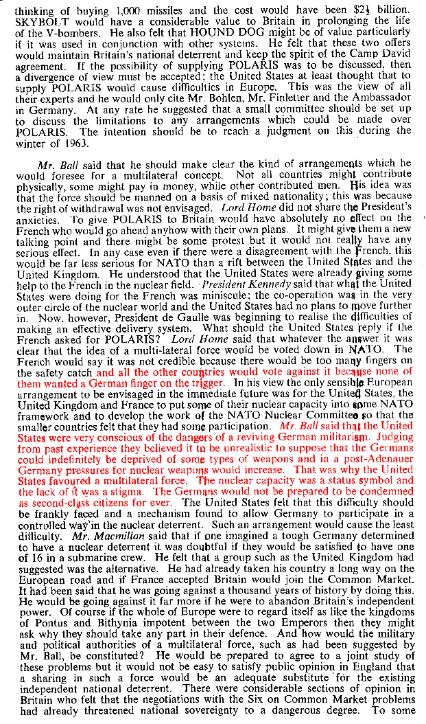 The deletions on the final page relate to the same issue, but in a slightly different way. The censors were trying to conceal the fact that Kennedy was not opposed in principle to the idea of nuclear forces under European national control, and in particular to forces under British and French control.